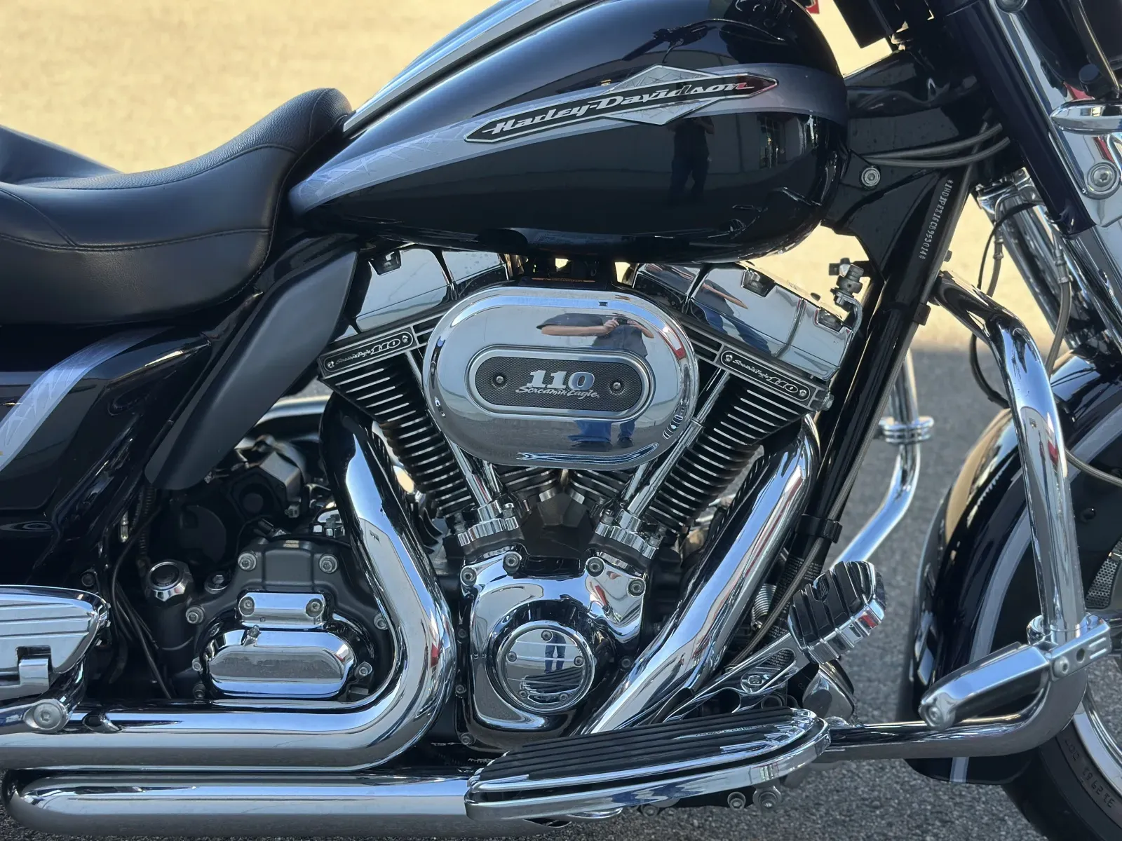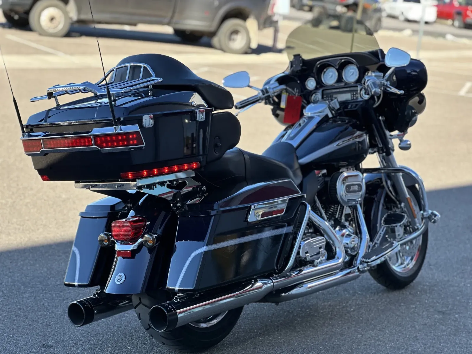 Exhaust: Chrome dual exhaust with 4-inch touring mufflers, chrome billet end caps with black spears, and chrome touring exhaust shields.