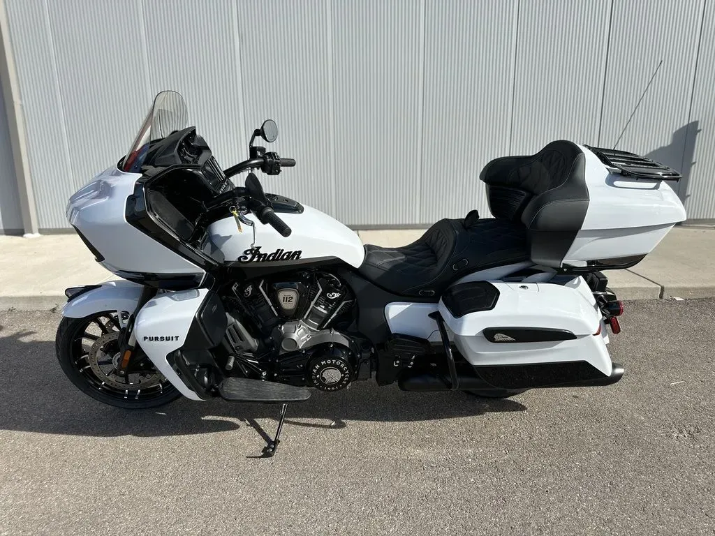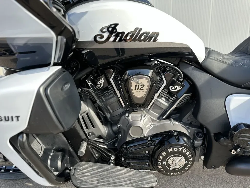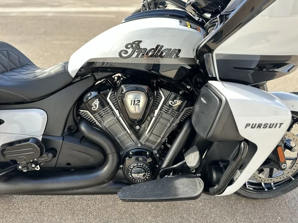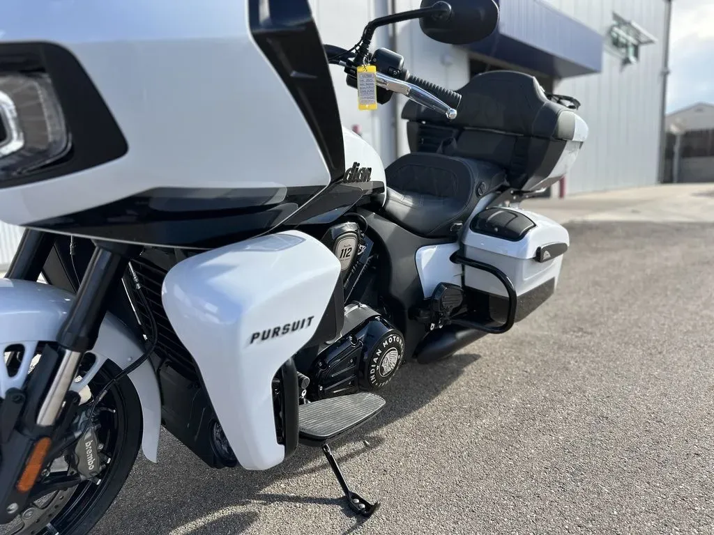 2025 Indian Motorcycle® Pursuit® Dark Horse® 112 w/PowerBand Audio Ghost White Metallic Crystal with Black Vivid