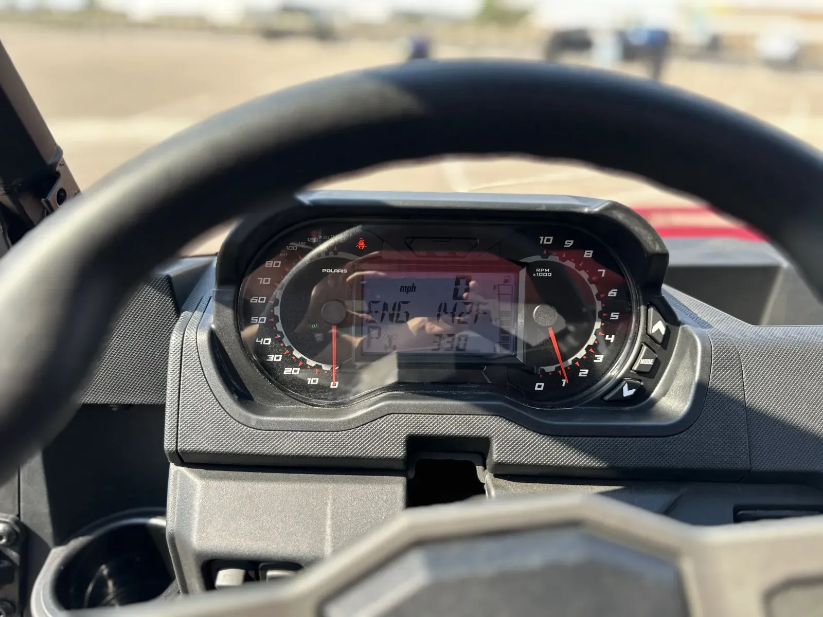 Dual-sweep Analog Dials w/ 4 in LCD Rider Information Center: User Selectable Blue/Red Backlighting & Brightness, Programmable Service Intervals, Speedometer, Tachometer, Odometer, Tripmeter, Clock, Hour Meter, Gear Indicator, Fuel Gauge, Coolant Temperature, Voltmeter, Service Indicator and Codes, Seat Belt Reminder, DC Outlet, USB Charge Port, Automatic Speed Limiting in 2 mph increments starting at 16 mph to max speed.