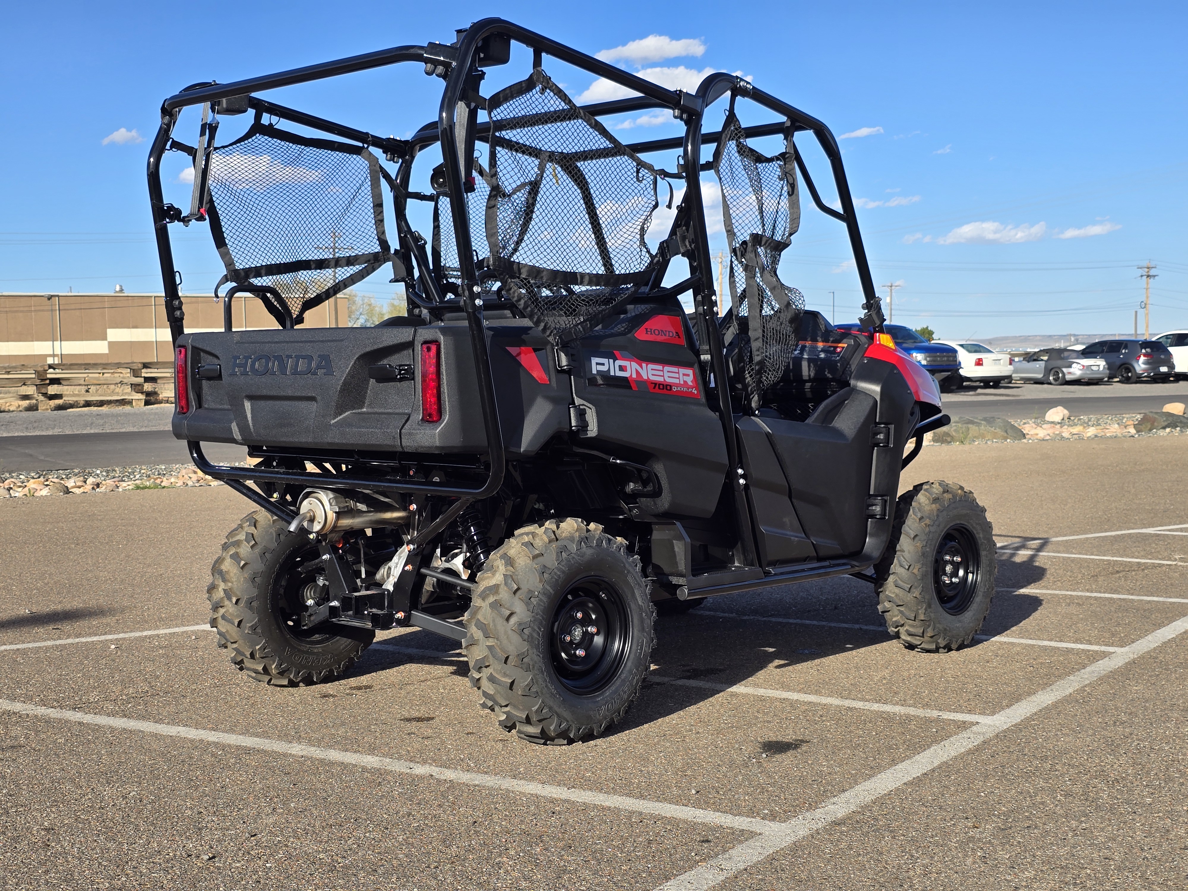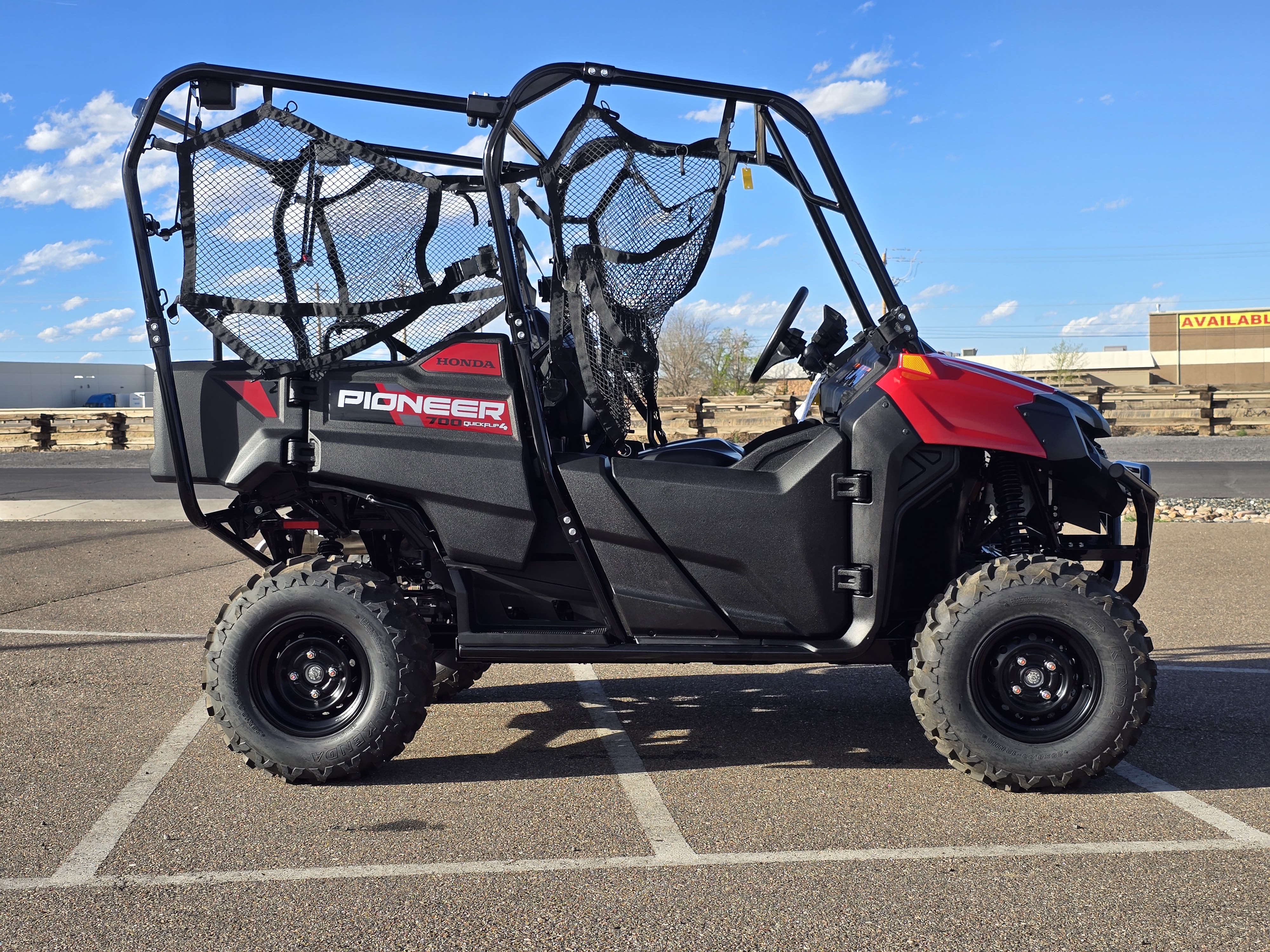 The 2026 Honda Pioneer 700-4 in Hero Red is a versatile, four-seat side-by-side utility vehicle, with new features for the model year that include increased in-cabin storage, Kenda tires, and additional charging ports. The Hero Red color is available on the standard Pioneer 700-4 base model.