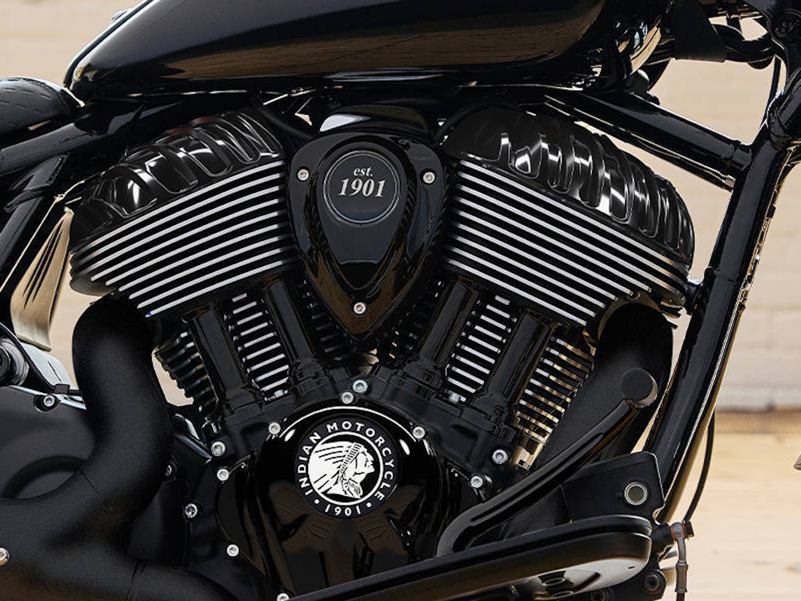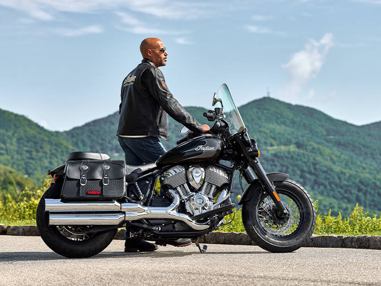 - Premium blacked out or chrome finishes, fork covers, wire wheels, and large headlight nacelle, and iconic Indian Motorcycle script badging on the tank, commanding attention at every corner.