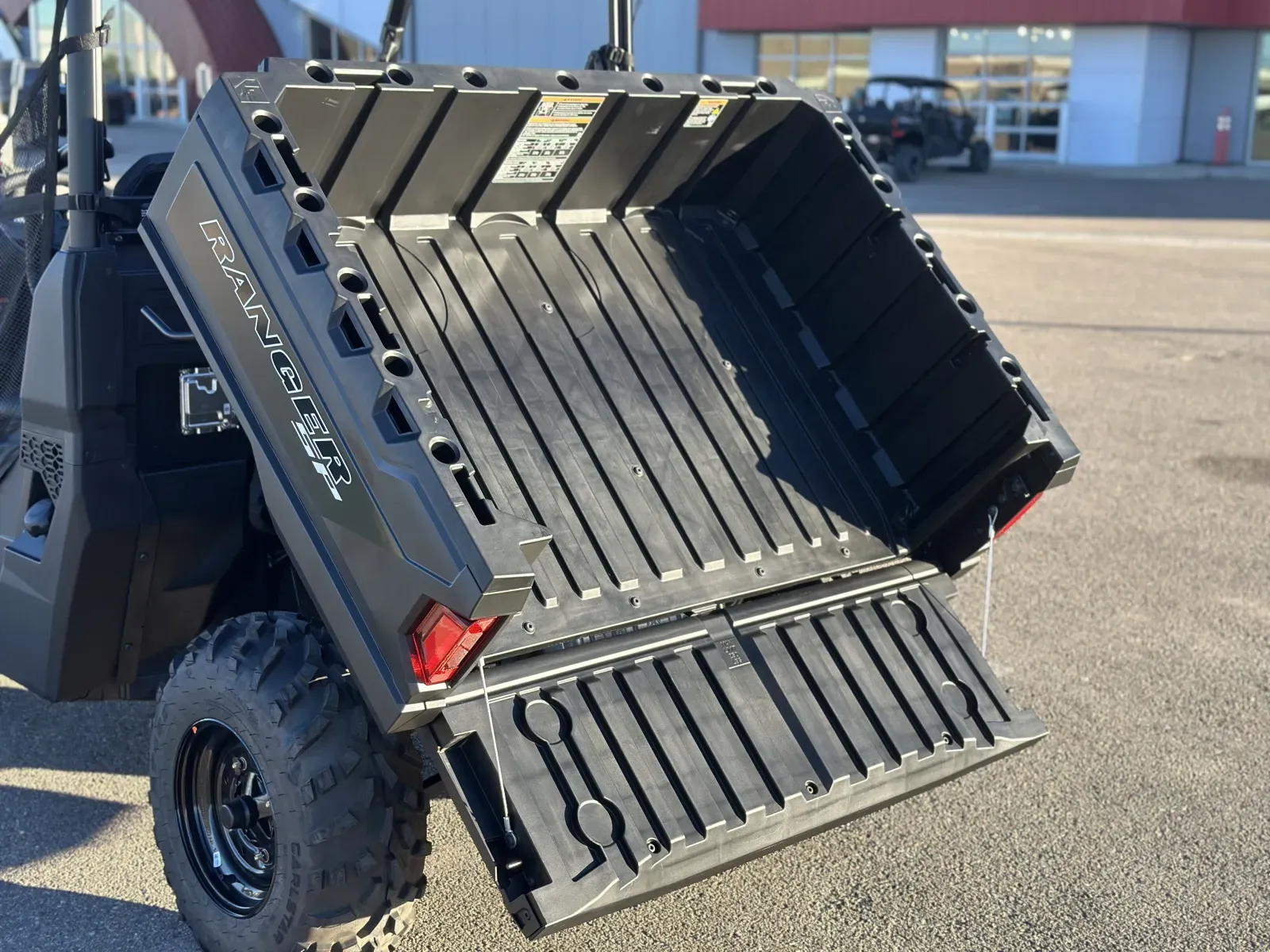 Gas-assist dump box with Lock & Ride accessory integration